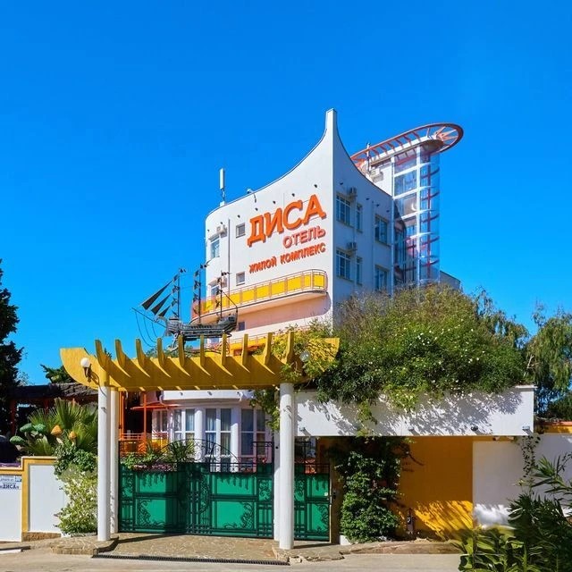 Отель "ДИСА" в 350 метрах от не многолюдного галечного пляжа п. Якорная щель, на территории расположен пышно цветущий сад с тропическими растениями и плодоносящими фруктовыми деревьями среди которых находятся два пруда с водными обитателями и цветущими водными растениями.